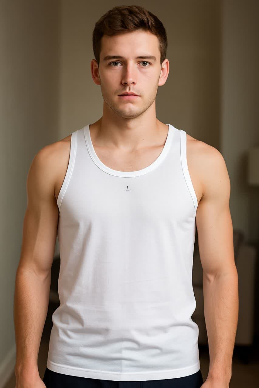 رکابی ساده سفید، مناسب استفاده روزمره آقایان، تهیه شده از پارچه راحت و تنفسپذیر با طراحی کلاسیک و سایز مناسب L.